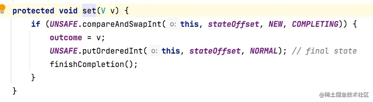 通常调用 get 方法获取任务结果的线程和执行任务线程并非同一个线程中,所以为保证 state 字段的线程安全性,state 字段的更新都是通过 Unsafe的compareAndSwapObject 方法使用 CAS 算法进行更新的。