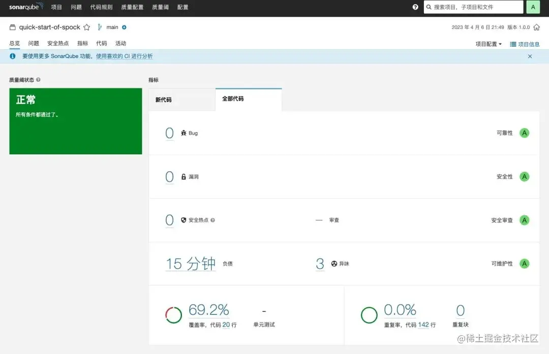 随后,我们直接回到 SonarQube 页面,可以看到 quick-start-of-spock 项目有数据了,如下图所示。