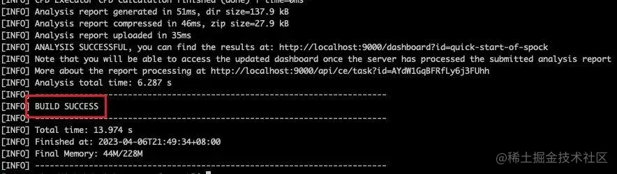 首先,在项目根目录下运行 mvn install 命令,成功后再运行 Sonar Scanner Maven 插件的分析命令,如下所示。