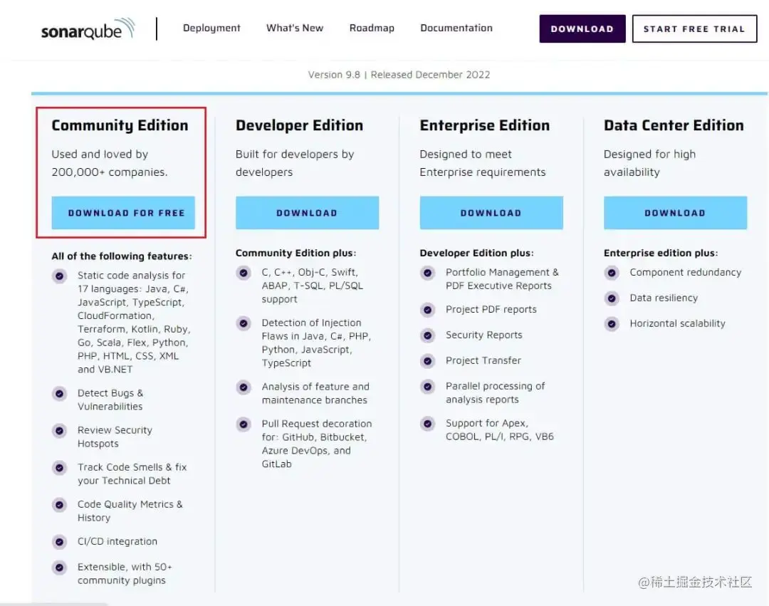 到 Sonar 官方网站下载 SonarQube:Clean Code | Developer First | Sonar,这里我们选择社区版,如下图所示。