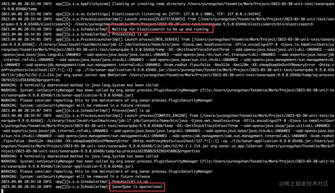 这里我们打开 bin 文件夹,可以看到有多个不同目录对应不同系统。我这里是 Windows 系统就打开 macosx-universal-64 目录,随后运行 ./sonar.sh start 命令运行。运行之后,会启动 SonarQube 所需要的各个服务,包括 ElasticSearch 等。如果一切正常,那么日志会提示 SonarQube is operational,如下图所示。