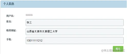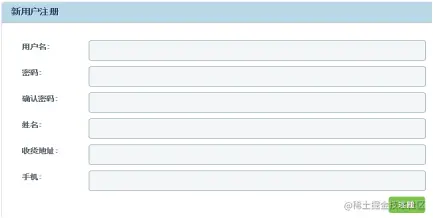 用户注册需要填写相应的信息,主要包括用户名、密码、确认密码、姓名、收货地址以及手机号码。用户注册页面的设计如图
