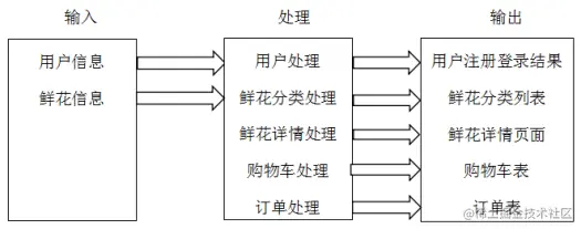 IPO图是输入--处理--输出图(Input-Process-Output)的简称。基本形式是画三个方框,在左边框中列出有关输入数据,在中间框内列出主要处理,在右边框中列出产生的输出数据。网上花店销售系统的输入数据主要是用户信息以及鲜花信息,处理主要针对用户、鲜花分类、鲜花详情、购物车以及订单,输出数据对应于处理过程。该系统IPO图如图