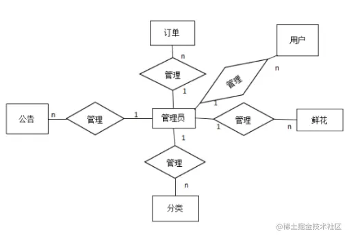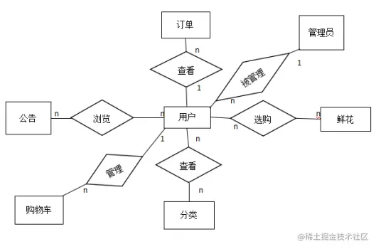 在该E-R图中,对于管理员实体,管理员可以对系统的公告、订单、分类、鲜花进行管理,对已注册的用户进行管理,因此它与其他实体的关系都是管理关系。