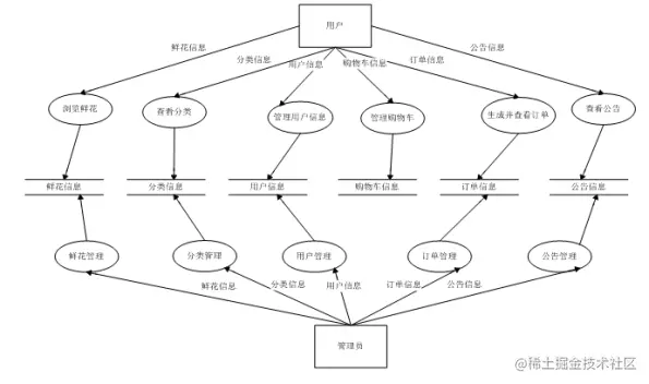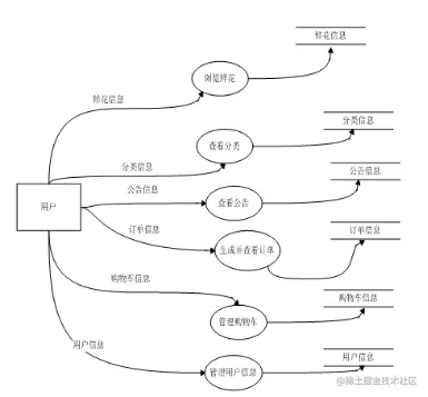 用户在系统中可以浏览鲜花、查看分类、管理用户信息、管理购物车、生成并查看订单、查看公告,本系统中用户数据流图如图