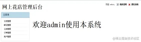 管理员登录成功后会进入系统后台页面,主要包括左侧的主菜单以及中间的欢迎页面。主菜单包括,分类管理,鲜花管理,公告管理,订单管理,用户管理。系统后台页