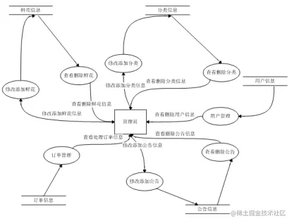 管理员在系统中可以进行鲜花管理、分类管理、用户管理、订单管理、公告管理,其中管理员可以对鲜花、分类和公告进行添加、修改、查看和删除,对用户进行查看和删除,对订单进行查看和处理。本系统中管理员数据流图如图