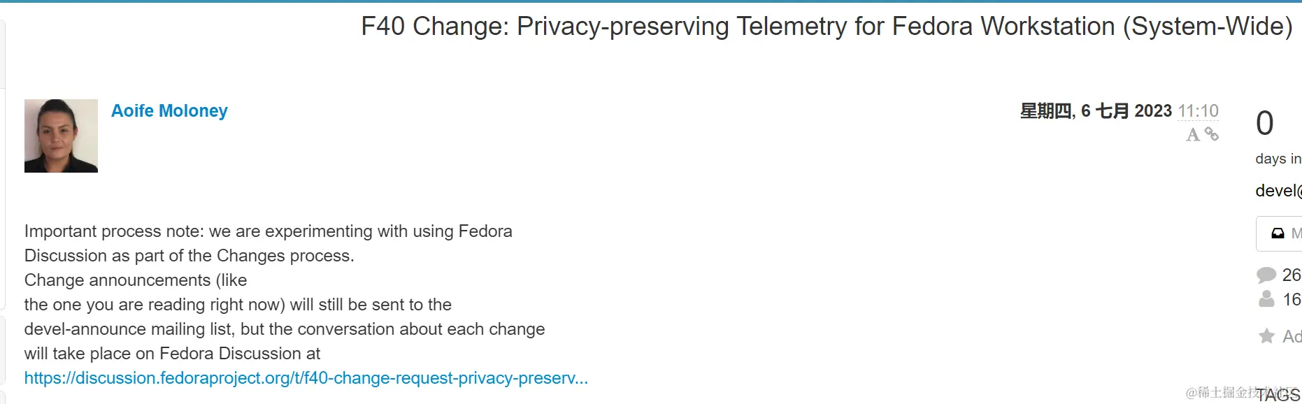 目前该提案已发布,并在 Fedora 开发列表上公开讨论,讨论中对收集的数据种类做了更详细的说明: