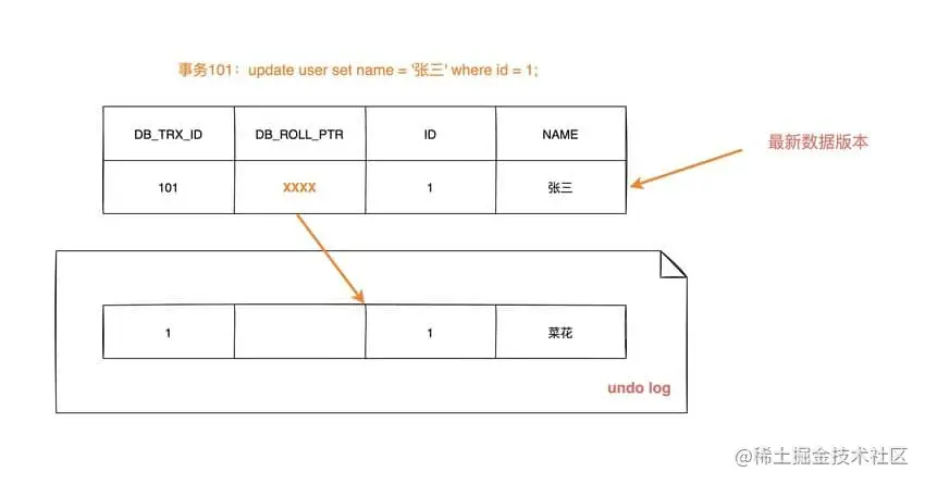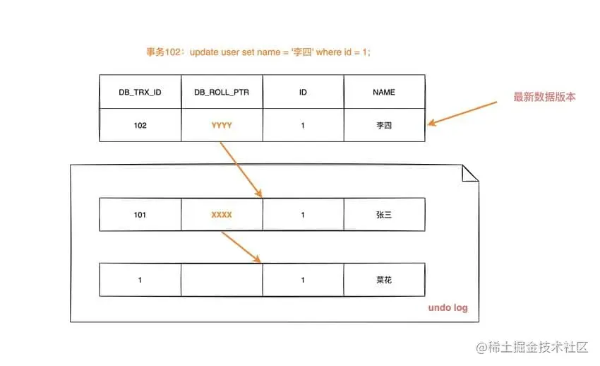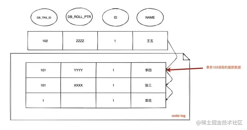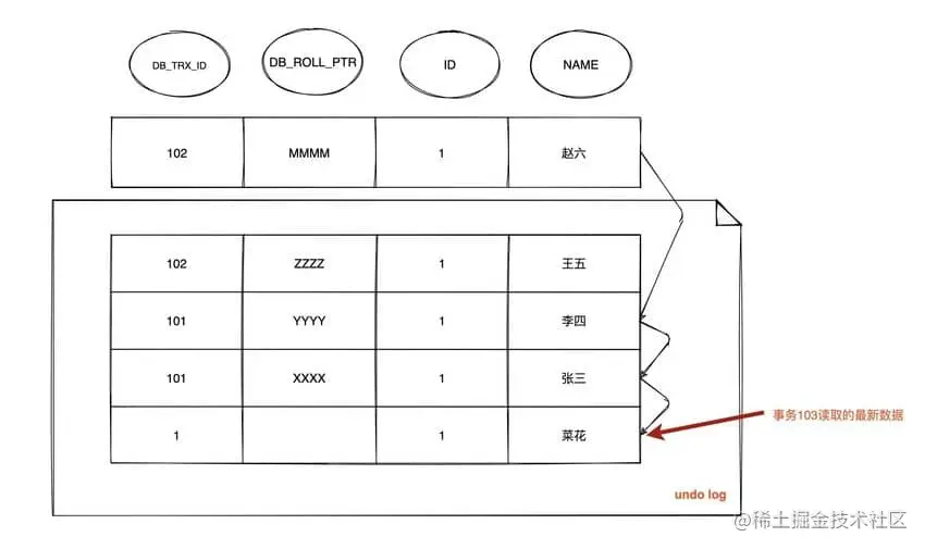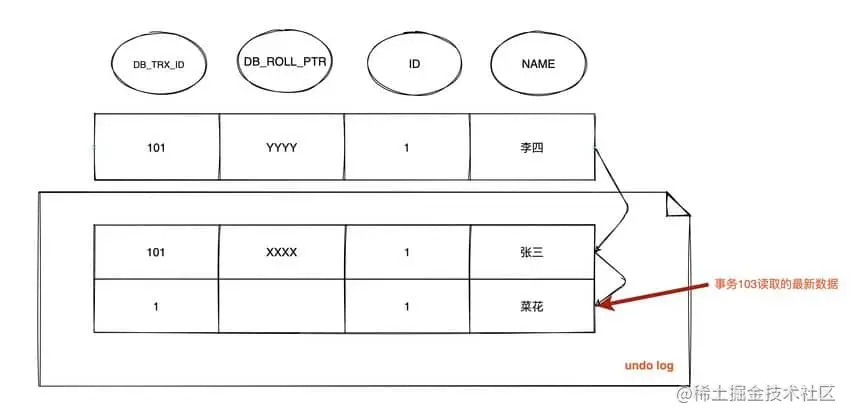 DB_ROLL_PTR找到undo log中的上一版本记录,上一条记录的DB_TRX_ID还是 101,不可见 - 继续找上一条