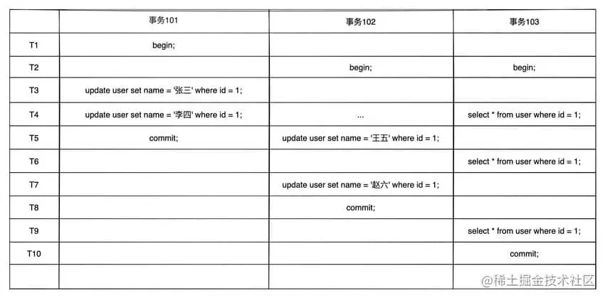 DB_ROLL_PTR找到undo log中的上一版本记录,上一条记录的DB_TRX_ID为 101,满足 101 < m_up_limit_id,记录可见,所以在T6时间点查询到数据为name = 李四,与时间 T4 查询到的结果不一致,不可重复读!