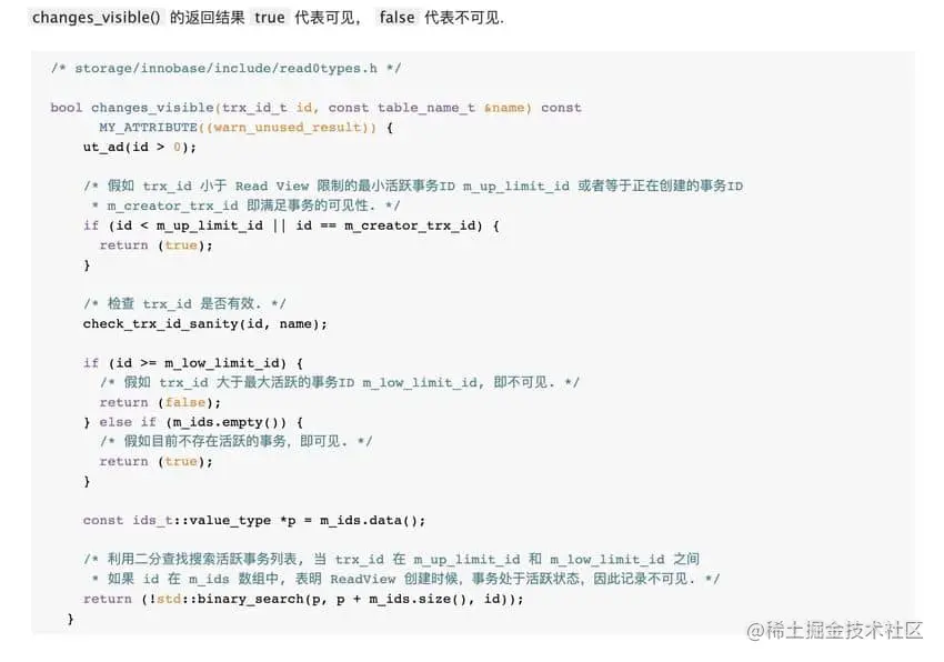如果 m_up_limit_id <= DB_TRX_ID < m_low_limit_id,表明最新修改该行的事务(DB_TRX_ID)在当前事务创建快照的时候可能处于“活动状态”或者“已提交状态”;所以就要对活跃事务列表 m_ids 进行查找(源码中是用的二分查找,因为是有序的)