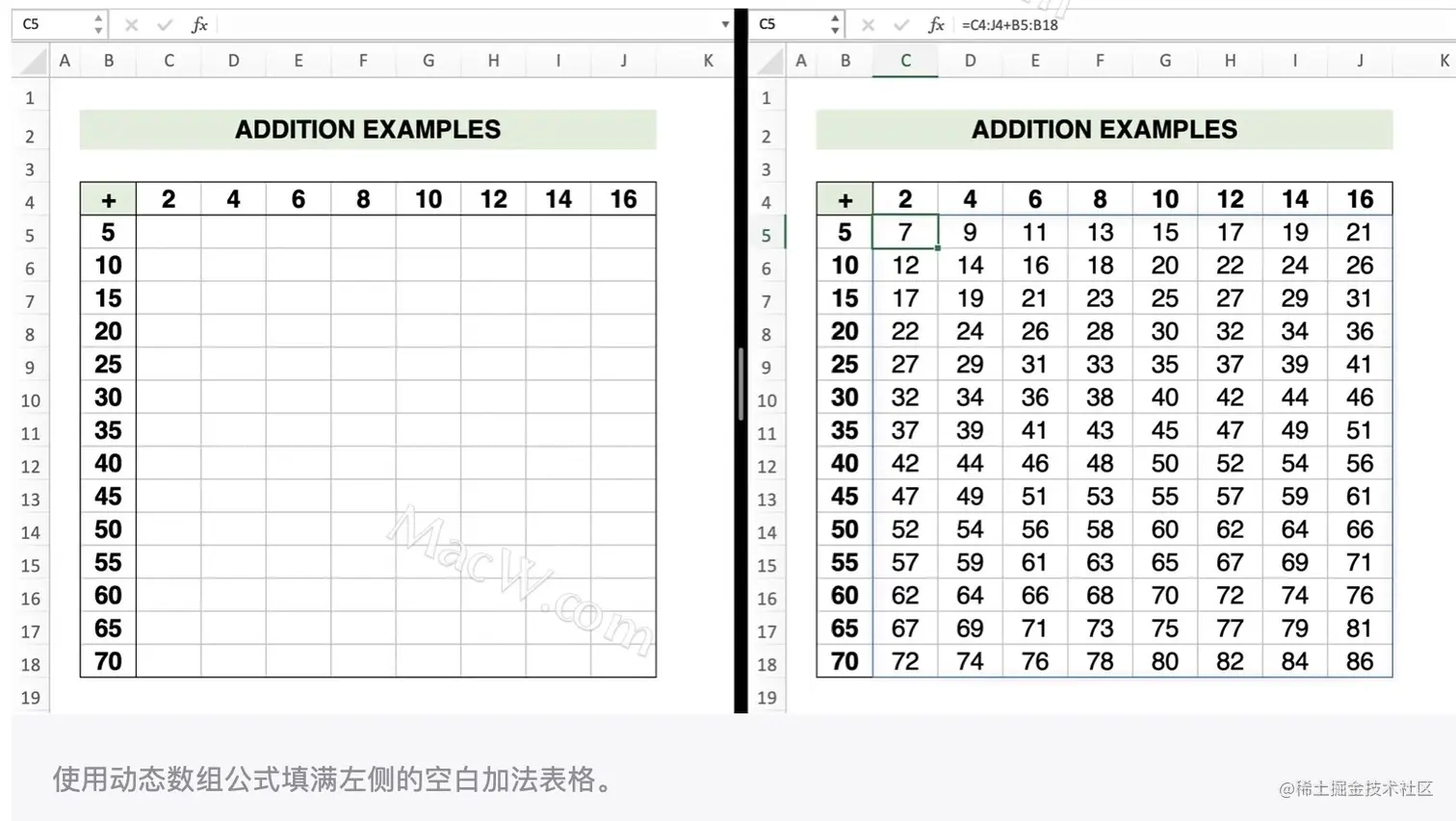 “动态”方式: 创建引用所有单元格的单一公式,一次性计算每个单元格的数值。 操作方法:以下表为例,在第一个答案单元格中输入=C4:J4+B5:B18 (C4:J4代表第一行的范围, B5:B18则代表第一列的范围)。按下 Return 键,数值就会自动填满整个表格!