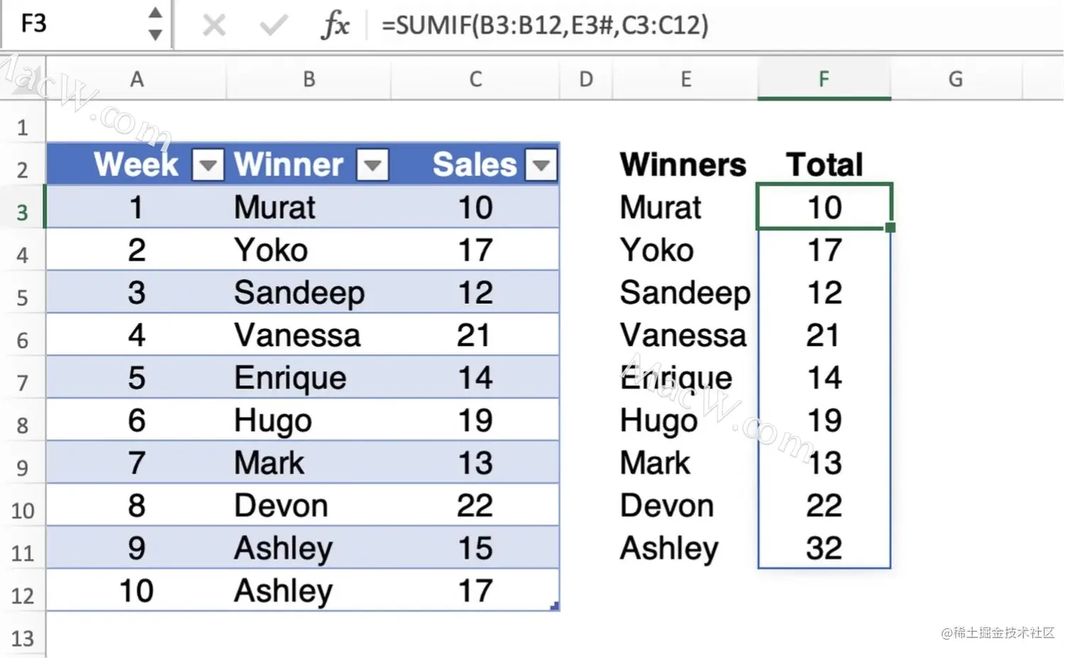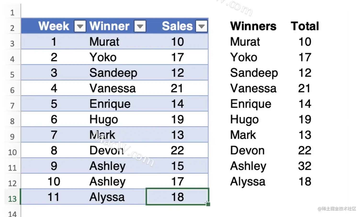 传统方式: 你可以使用=SUMIFO 函数来按人汇总销售额,但因为每周都会决出新的销售冠军,表格范围会不断扩大,这意味着你每周都需要手动调整公式。
