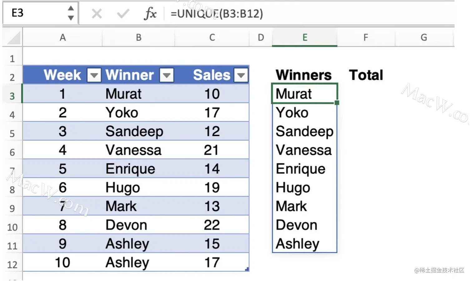 操作方法: 下面的表格显示了目前为止的每周冠军数据。使用一个新的 UNIQUE( 函数,可以轻松列出销售人员名单,避免重复输入。在工作簿的空白区域,输入公式 =UNIQUE(B3:B12),其中 B3:B12是当前的冠军名单: