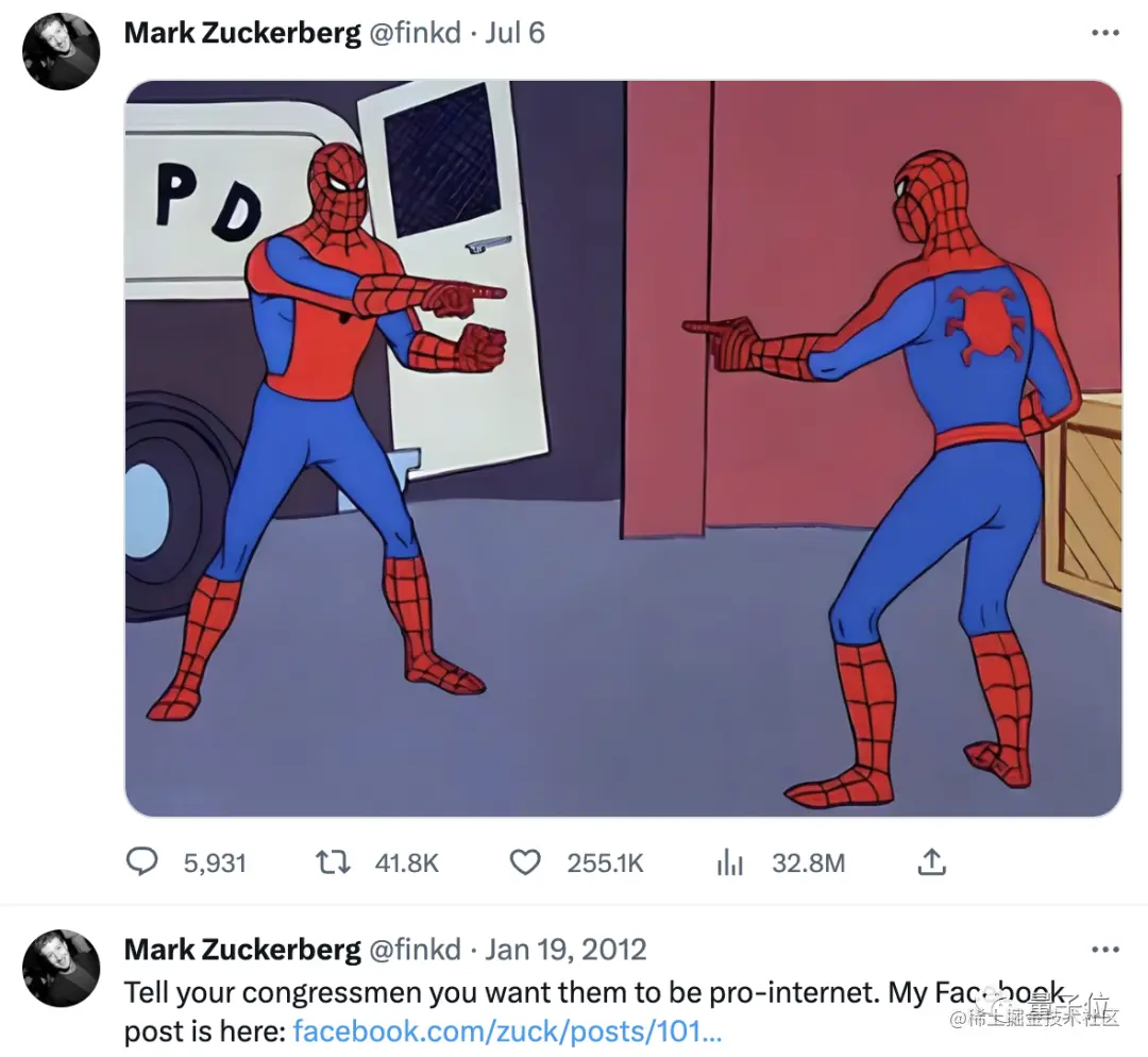 与此同时,扎克伯格则发布了自2012年以来的唯一一条推特,用蜘蛛侠的表情包嘲笑马斯克。