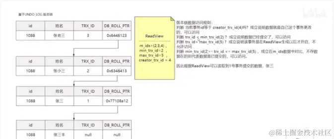 刚才我们说了,读是不加锁的,他是从版本链中获取数据的,那么版本链中有好几条数据,那么应该读取哪一条数据呢?时间点不同怎么保证读取的数据是准确的的呢