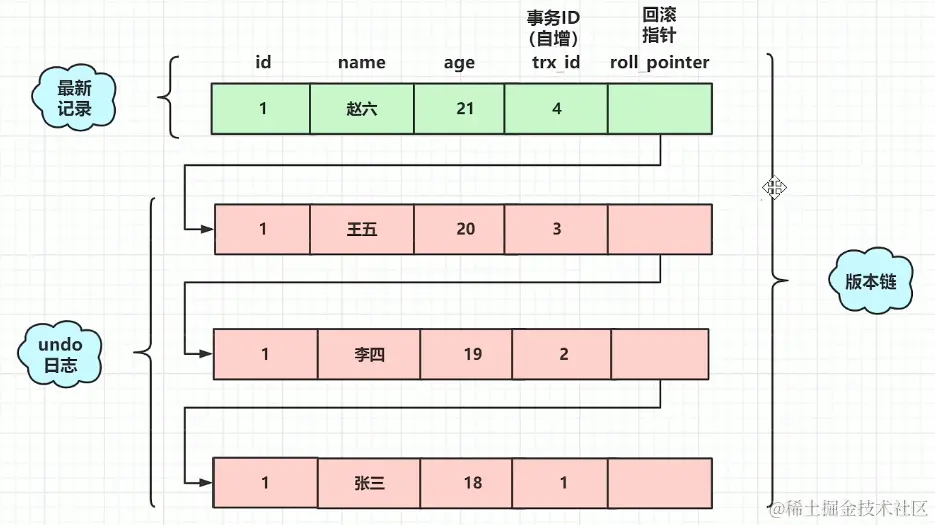 mvcc中文叫多版本并发控制,顾名思义是通过版本号控制的,那么这个版本信息是记录在哪里的呢?答案是记录在undo日志里,并发执行的时候多个事物的操作记录都记录在undo日志里,多个操作记录形成一个链条,每一个记录都会指向它的上一个记录,那么他是如何做到的呢?innod引擎默认给数据库表新增2个字段,一个是事物id(trx_id),递增,一个是回滚指针(roll_pointer),用来指向它的上一个操作记录,如图在数据库4种隔离级别下,随着隔离级别的升高,问题逐渐被解决,那么在串行化的隔离级别下,是通过加锁的方式,保证多个并发执行下的多个事物逐个执行,这个保证事物执行时候的准确性,但同时也牺牲了性能,那么有没有一种不加锁的机制呢?因为大部分情况下,都是读的场景,读数据场景如果也加锁那就太不友好了,正式基于这样的思想才有了mvcc机制,读不加锁,读写不冲突,提高并发能力