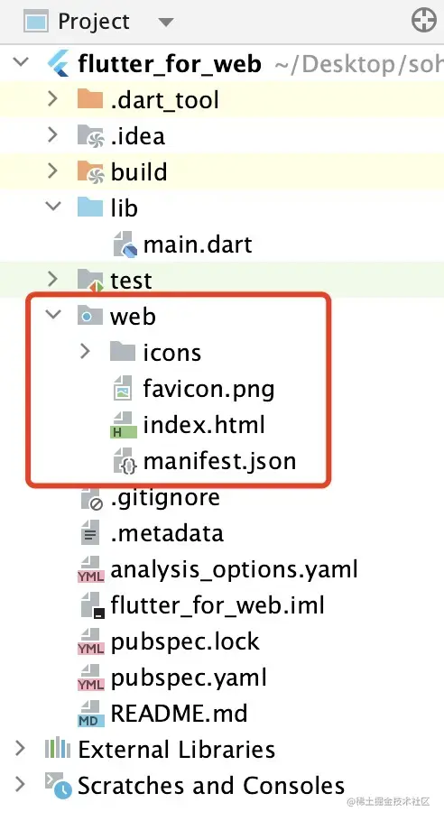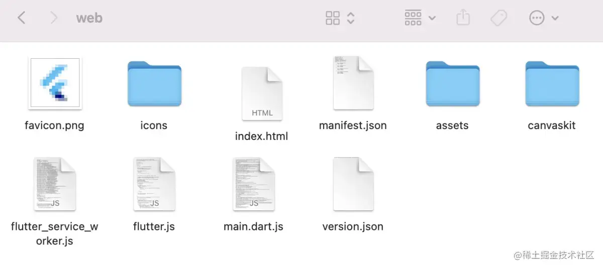 我先来简单说明一下FlutterWeb编译产物,重点有两个:flutter.js和main.dart.js。其中flutter.js为入口的js文件,我们可以打开web目录下index.html: