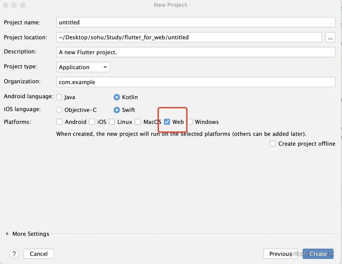 创建一个New Flutter Project,在选择Platforms的时候只勾选Web,然后直接Create。