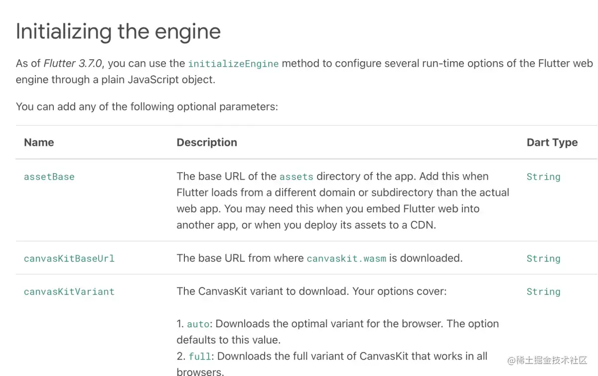 其中loadEntrypoint()方法可以传递entrypointUrl参数来指定main.dart.js的路径。而initializeEngine()方法可以通过传递assetBase参数来指定CDN资源路径。这么看来我们完全可以通过将这两个参数设置为绝对路径来解决main.dart.js的加载与CDN资源路径的问题。需要注意的是initializeEngine()方法是Flutter3.7.0开始才支持的。