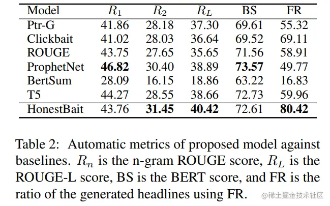 而如果使用类似 ROUGE-n、ROUGE-L、BERT score 等评估指标,HonestBait 框架也展现了良好的性能,在 中都取得了最高的得分,而值得注意的是作者使用 FR 预测器监测是否生成标题包含 FRs 结构,上表显示由 HonestBait 生成的标题中有 80.42% 都使用了 FRs 结构。