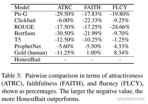 同时,作者又对 HonestBait 框架以及其他对比模型生成的标题进行了一项人工评估,评估生成标题的吸引力、真实度以及流畅程度,作者从 PANCO 数据集中随机选择了 100 个样本,要求志愿者根据以下准则进行标题选择:(1)哪个标题使你想要进一步阅读?(2)哪个标题更符合文章内容?(3)哪个标题更加流畅?人工评估的结果如下表所示: