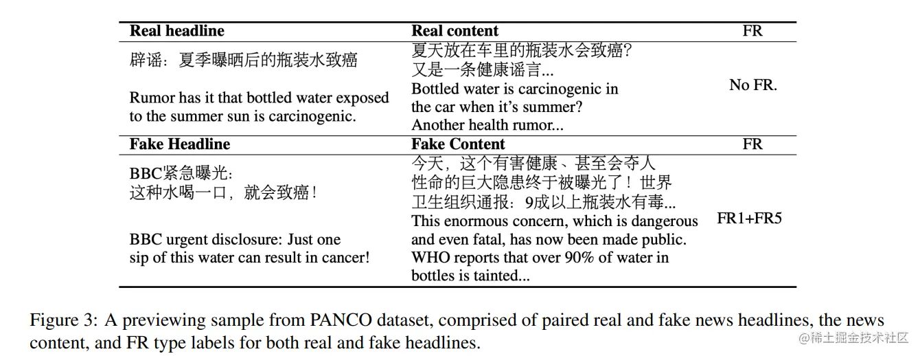 作者收集了“Paired News with Content(PANCO)”数据集,共计包含 7930 个真/假新闻对以及其对应的 FR 类型,数据集的一个小例子如下图所示: