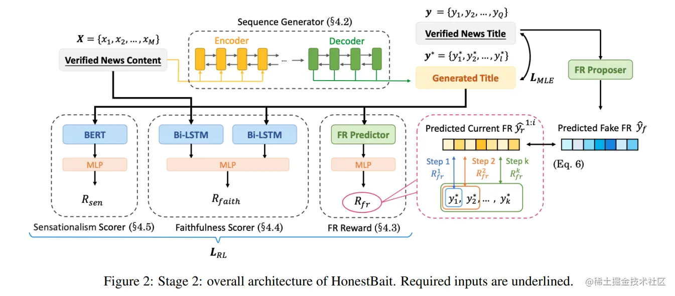 在验证了 FRs 的有效性后,论文提出了 HonestBait 框架,HonestBait 框架结合了 FRs 技术与真实性验证,总的而言,HonestBait 框架包含两个阶段,在阶段1,通过预训练一个 FRs 预测器和一个 FRs 生成器来生成一个标题,预测器用来判断标题是否包含 FRs 结构,而生成器则用于生成对应的 FRs 要素的组合,第一阶段的主要目标在于从假新闻中学习到 FRs 的结构,用于对真实新闻标题进行重写。