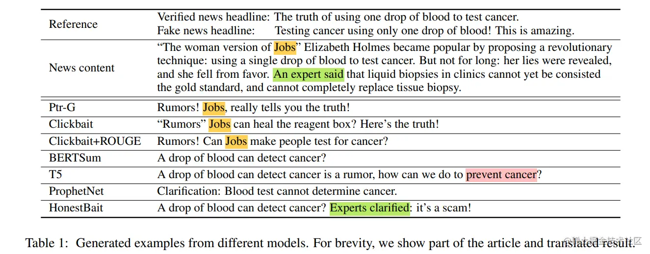 首先,作者对比几种主流的可以完成标题生成任务的模型进行了对比试验,几个对比模型以及 HonestBait 框架生成的标题直观如下,可以看到 HonestBait 框架更加准确与精准的理解了新闻的意思,并以 FRs 的模式生成了一个比较成熟的标题:
