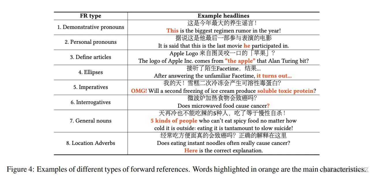 Forward References 是一种借鉴心理学与新闻学研究用于生成有吸引力标题的方法,具体而言,Forward References 方法的核心思想就是利用标题为读者与新闻内容之间创造信息缺口,以激发读者的阅读兴趣,譬如标题“想要成为令人羡慕的一对吗?12件幸福夫妇必做的事情...就是这么简单!”驱使读者想要了解需要做的事情是什么。从类型上讲,FR 可以被分为以下几种类型: