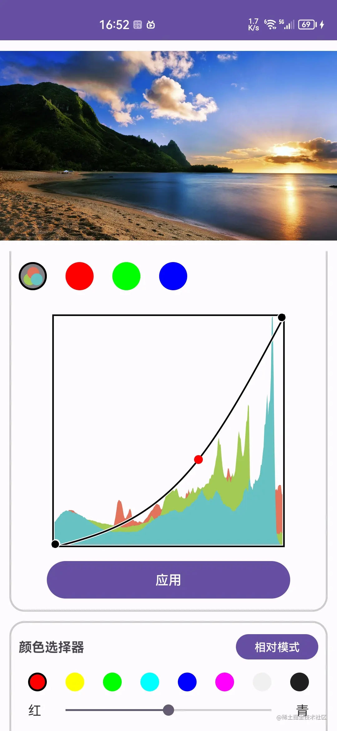 - 颜色选择器:OpenCvIn.changeColorByChannelPro(Bitmap bitmap,Bitmap mask, float redRed, float redGreen, float redBlue,float redBlack, float greenRed, float greenGreen, float greenBlue,float greenBlack, float blueRed, float blueGreen, float blueBlue,float blueBlack, float cyanRed, float cyanGreen, float cyanBlue,float cyanBlack, float yellowRed, float yellowGreen, float yellowBlue,float yellowBlack, float carmineRed, float carmineGreen, float carmineBlue,float carmineBlack, float whiteRed, float whiteGreen, float whiteBlue,float whiteBlack, float blackRed, float blackGreen, float blackBlue,float blackBlack, boolean isRelative);