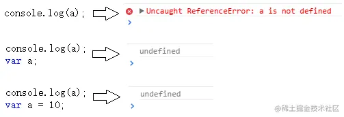 第一段代码抛出异常:a未定义,这很正常。但第二段和第三段代码先在控制台输出a,之后才对a进行声明,赋值,结果控制台输出a的值是 undefined,并没有抛出异常,说明控制台输出a之前,a已经被定义了。