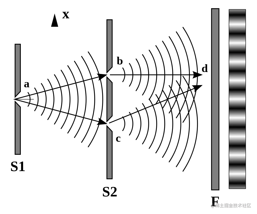 当光子通过两个狭缝后再次汇聚时,它们的波函数会叠加形成干涉图样。干涉图样的强度分布取决于光子通过两个狭缝的幅度和相位差。如果两个狭缝的路径差为整数倍的波长,干涉将是建设性的,形成亮条纹;如果路径差为半波长,干涉将是破坏性的,形成暗条纹。