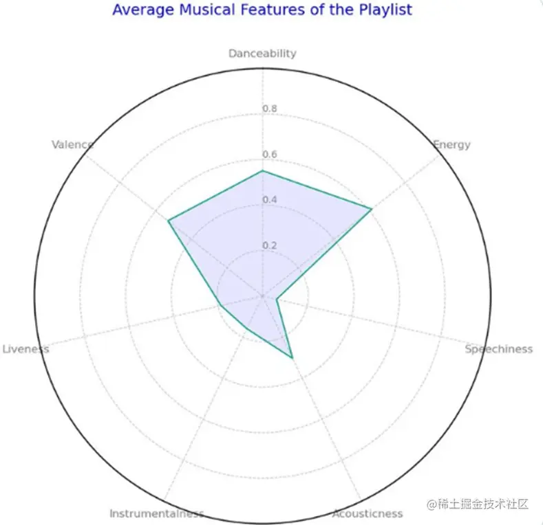 5、自动创建雷达图, 例如,分析完某用户 300 小时的 Spotify播放列表后,ChatGPT自动生成了雷达图。