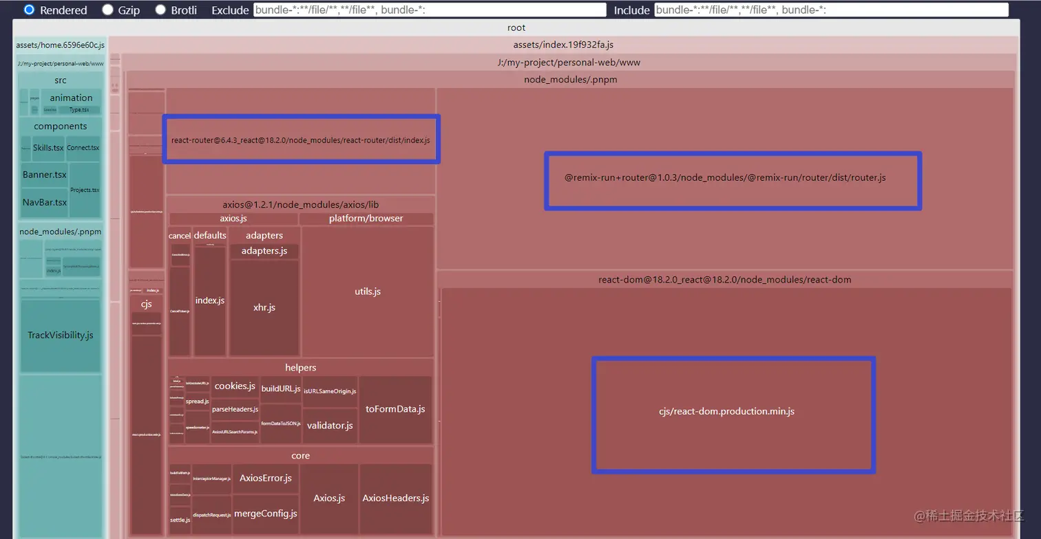 这里采用我之前的项目 personal-web 进行打包分析,可以看到有部分包是很大的,而且都是一些框架依赖或者相关的插件: