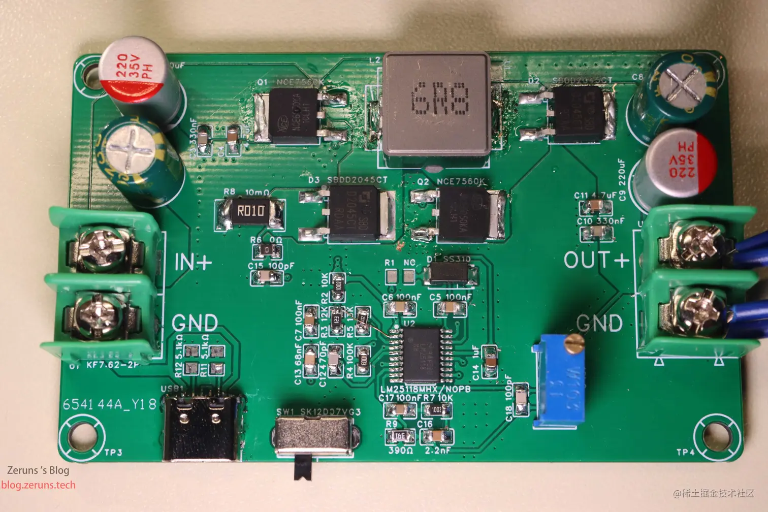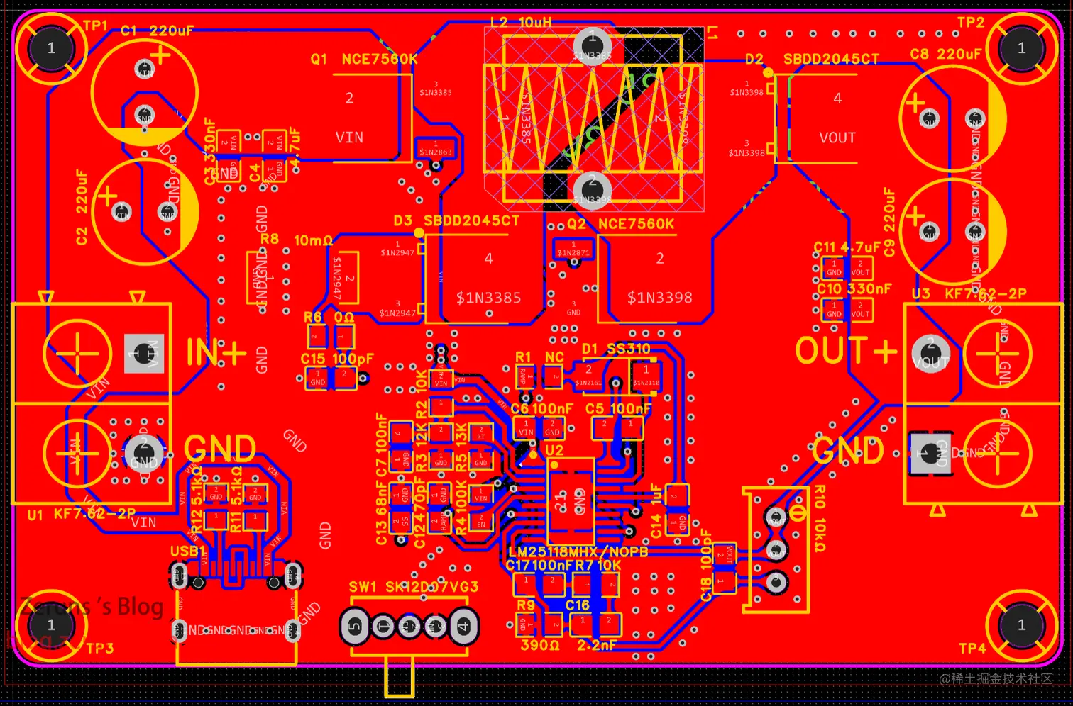 电感我也换成了6.8μH的了。还有就是下面实物图中的LM25118芯片的2脚UVLO因为画原理图时那根线没连上,所以飞了根线上去,下面的PCB图和原理图都已修正了。