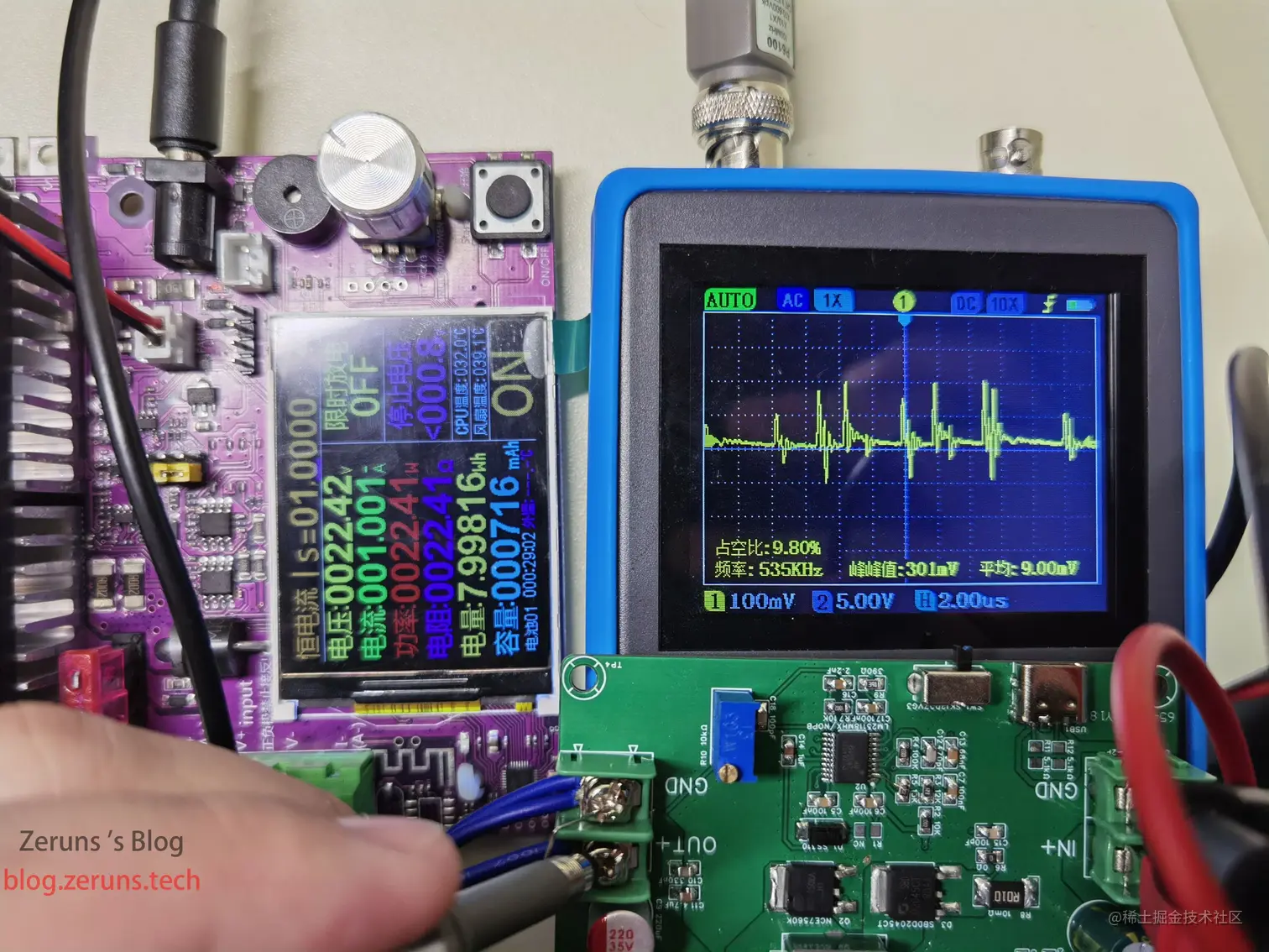 12V输入,23V 1A 输出时,纹波峰峰值300mV左右。