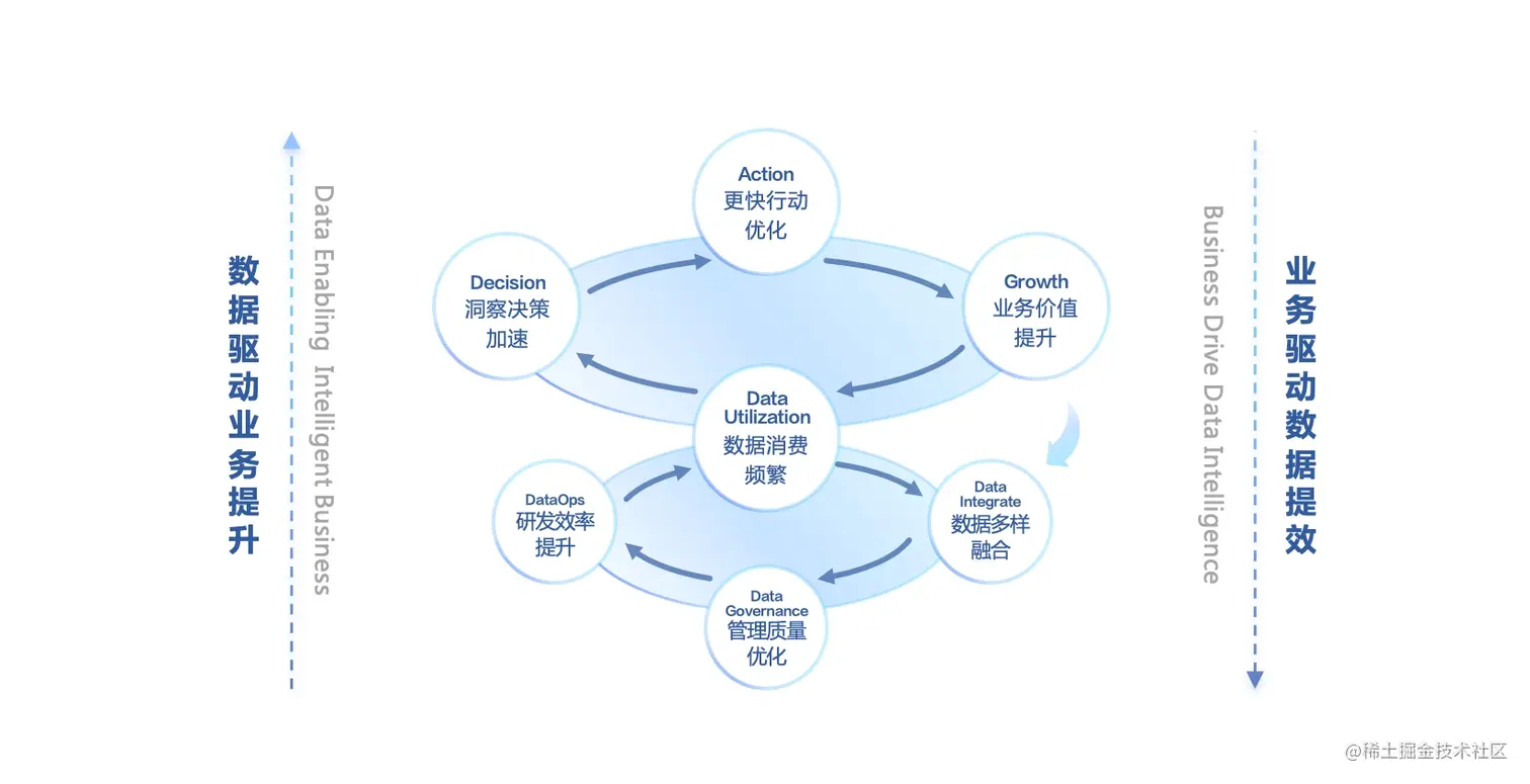 数据飞轮,是火山引擎基于字节跳动10年数据驱动理念沉淀而来的经验模式,今年4月一经推出便备受企业关注。它强调“以数据消费促数据生产,以数据消费助业务发展”,通过“数据消费”这一出发点,转动企业业务应用层和数据资产层的两个飞轮。