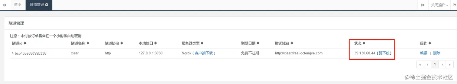上一步我们填写隧道信息并开通之后,会跳转到隧道管理页面。此页面会有一个客户端下载链接地址。如下图所示