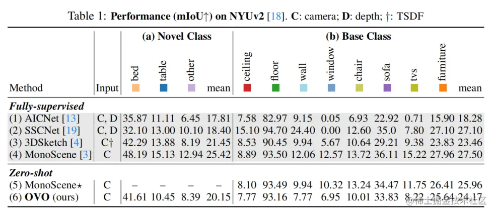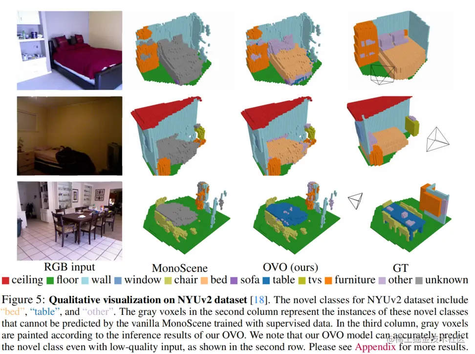 论文在NYUv2数据集上评估了OVO的性能,并将结果列在表1中。可以发现,在新颖类别上,OVO取得了竞争性的结果,甚至优于一些使用深度信息的监督方法。尽管在基础类别中略有性能下降,但通过实验证明这并不是由于论文的模型设计引起的,而可能是标签合并过程的影响。