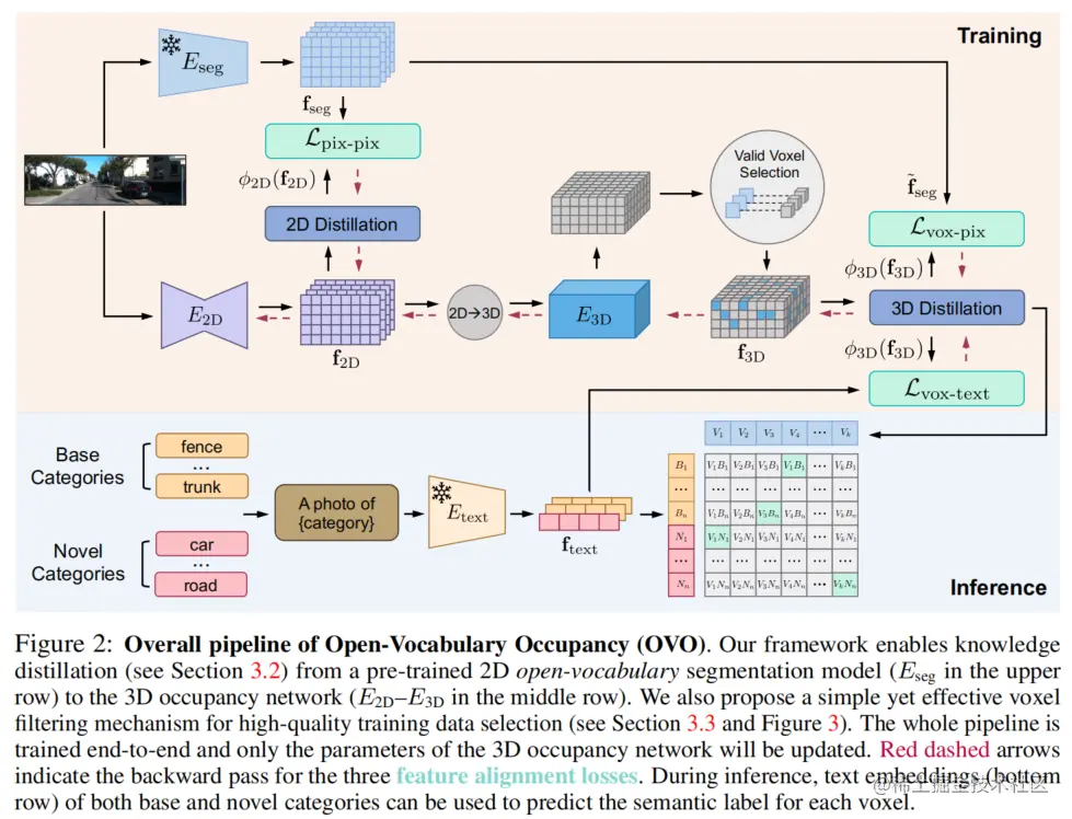 图2展示了论文的整体框架。主要包含四个组件:(1) 一个2D网络(),从输入图像中提取2D特征,(2) 一个2D到3D特征转换模块,将2D表示提升到3D空间,(3) 一个3D网络(),通过学习场景内的语义关系来优化3D特征图,和 (4)一个占据头部,用于推断3D特征图中每个体素的几何和语义信息。文章的重点是**给定一个预训练的2D开放词汇分割模型,如何将其识别任意物体类别的知识融入到3D占据网络中?**本文详细介绍了三种对齐技术,以实现这一目标。