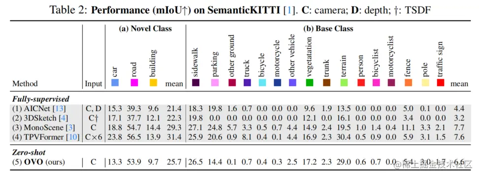 论文在SemanticKITTI数据集上验证了OVO,并将结果列在表2中。实验结果再次表明,OVO方法在新颖类别上超过了AICNet和3DSketch,同时在基础类别上取得了可比较的结果,证明了论文方法在不同场景中的稳健性和泛化性。