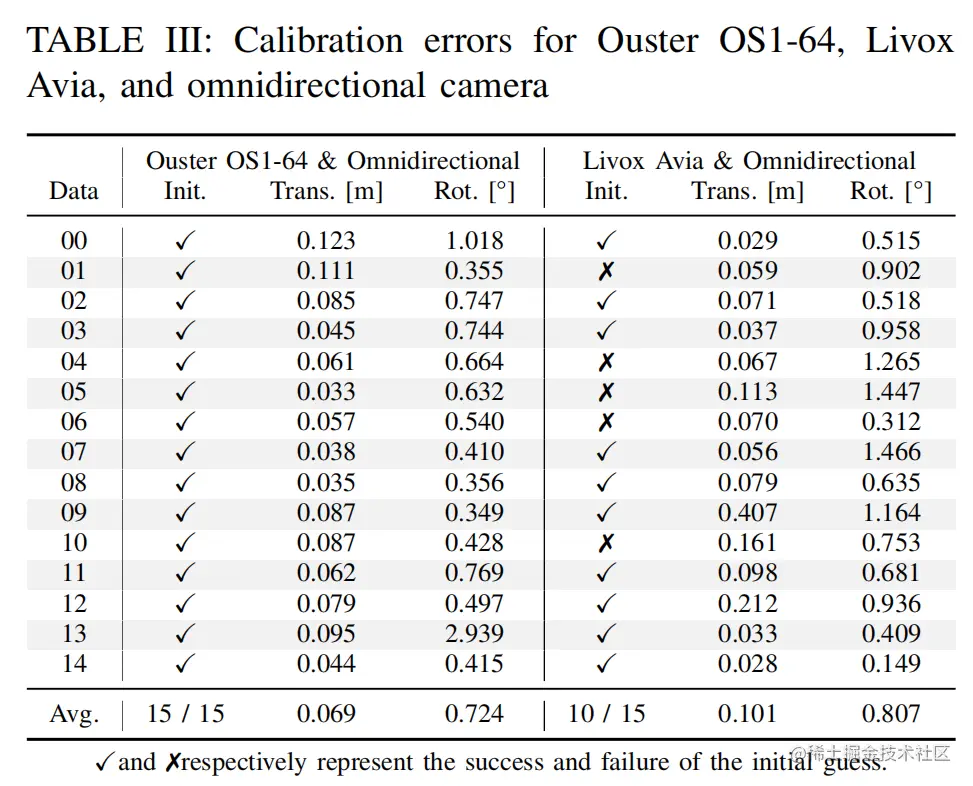 表III总结了全景相机的标定结果。对于Ouster LiDAR,初始估计成功率高且校准误差低。然而,Livox LiDAR和全景相机的组合下,初始估计成功率下降且校准误差较高。这可能是因为全景相机图像仅覆盖了一小部分环境,并且分辨率不足以表示细节。使用更高分辨率或多个图像可能可以改善校准准确性。