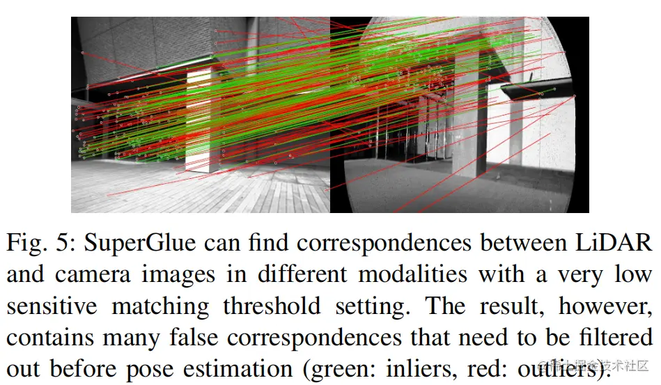 论文使用SuperGlue流程找到LiDAR强度图像和相机图像之间的对应关系。它通过SuperPoint检测关键点,并使用图神经网络找到它们之间的对应关系。预训练的权重在MegaDepth数据集上。匹配阈值设置较小以获取足够的对应关系,但可能会导致错误的对应关系产生,如上图所示。