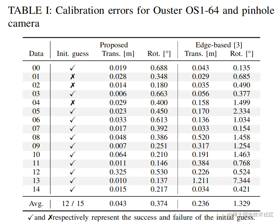表I总结了Ouster LiDAR和针孔相机组合的标定结果。对于初始猜测估计,如果平移误差小于0.5米,旋转误差小于1.0°,论文认为初始猜测估计是成功的。提出的算法对于12个数据对提供了合理的初始猜测。精细配准算法在所有数据上表现良好,平均校准误差为0.043米和0.374°。与此相比,基于边缘对齐的方法在某些数据对上显示出较大的校准误差,平均校准误差为0.236米和1.329°。这是因为其边缘提取对环境变化敏感,无法正确提取边缘点。