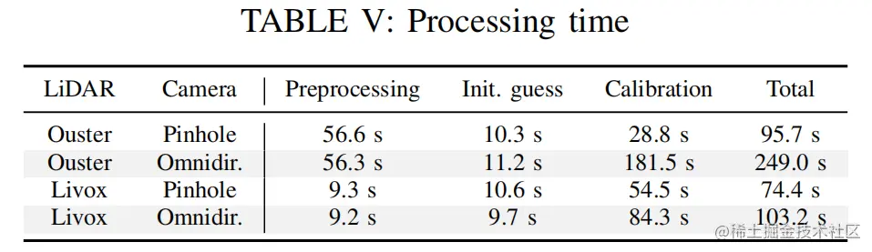 根据 LiDAR 和相机模型的不同组合,标定 LiDAR 相机变换所需的时间介于 74 到 249 秒之间。Ouster LiDAR 和全景相机的组合需要更长的时间,因为两个传感器都具有 360° 的视场,需要投影大部分点云。这些处理时间在离线校准中是可接受的