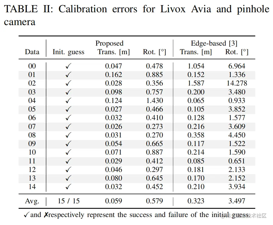 Livox LiDAR和pinhole相机的组合在表II中展示了较好的初始估计和精细配准结果,平均标定误差为0.069米和0.724°,优于基于边缘的校准方法的结果。