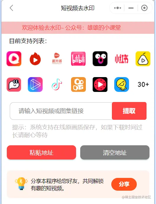 去水印不用多解释,就是将各大短视频平台的视频,拿过来后,将水印去掉,支持30+个短视频平台,注意:不可以解析违法等带敏感词的视频哈,加入了过滤机制了,如果是正常视频,解析的时候提示安全过滤没有过的话,可以将链接中的汉字去掉重新试试,有问题,可以直接联系我。