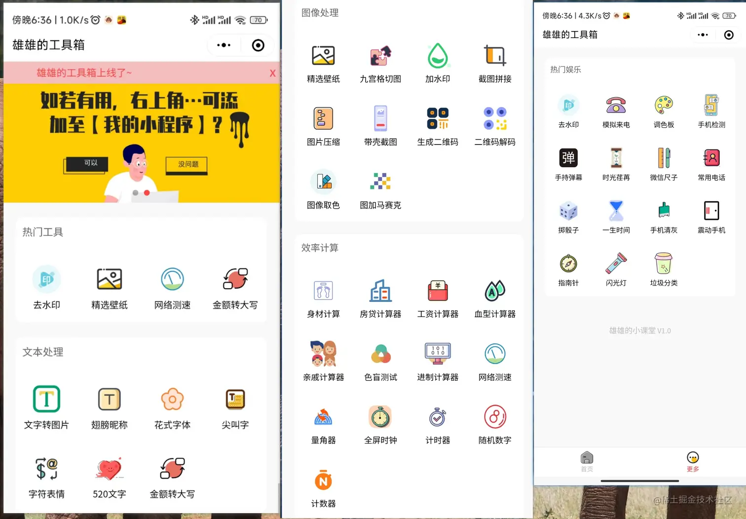 介于此,我就通过业余时间自己上线了个小程序雄雄的工具箱,绝对不会加看广告之后才能操作这种的,完全免费大家使用,目前上线一周,访问量达到了400+,下面对该工具箱做个简单的介绍。