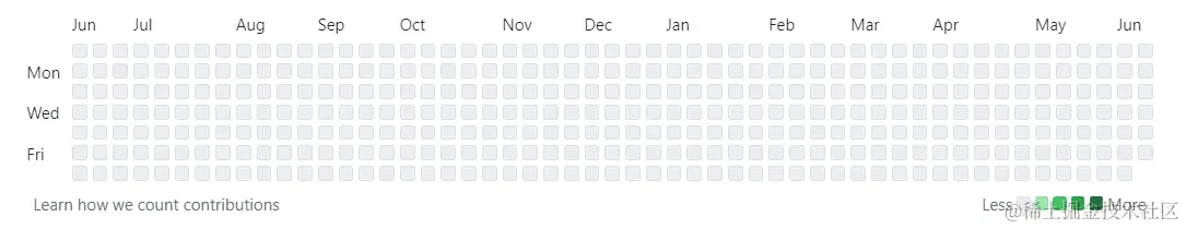 作为一名程序员,我们肯定有自己的github账号,在github个人主页会展示你最近十二个月的提交情况,用绿色的深浅表示你当日提交次数的多少。如果你将个人的github主页链接放在简历上,面试官在面试时便可能会点进去,首先映入眼帘的便是这提交次数展示区域。但学生党平时要忙于个人的学业、社畜党要忙于自己的工作,几乎没有多少时间来做自己的项目、建设自己的github仓库,这样则可能会导致这片区域是空白的,像下面一样: